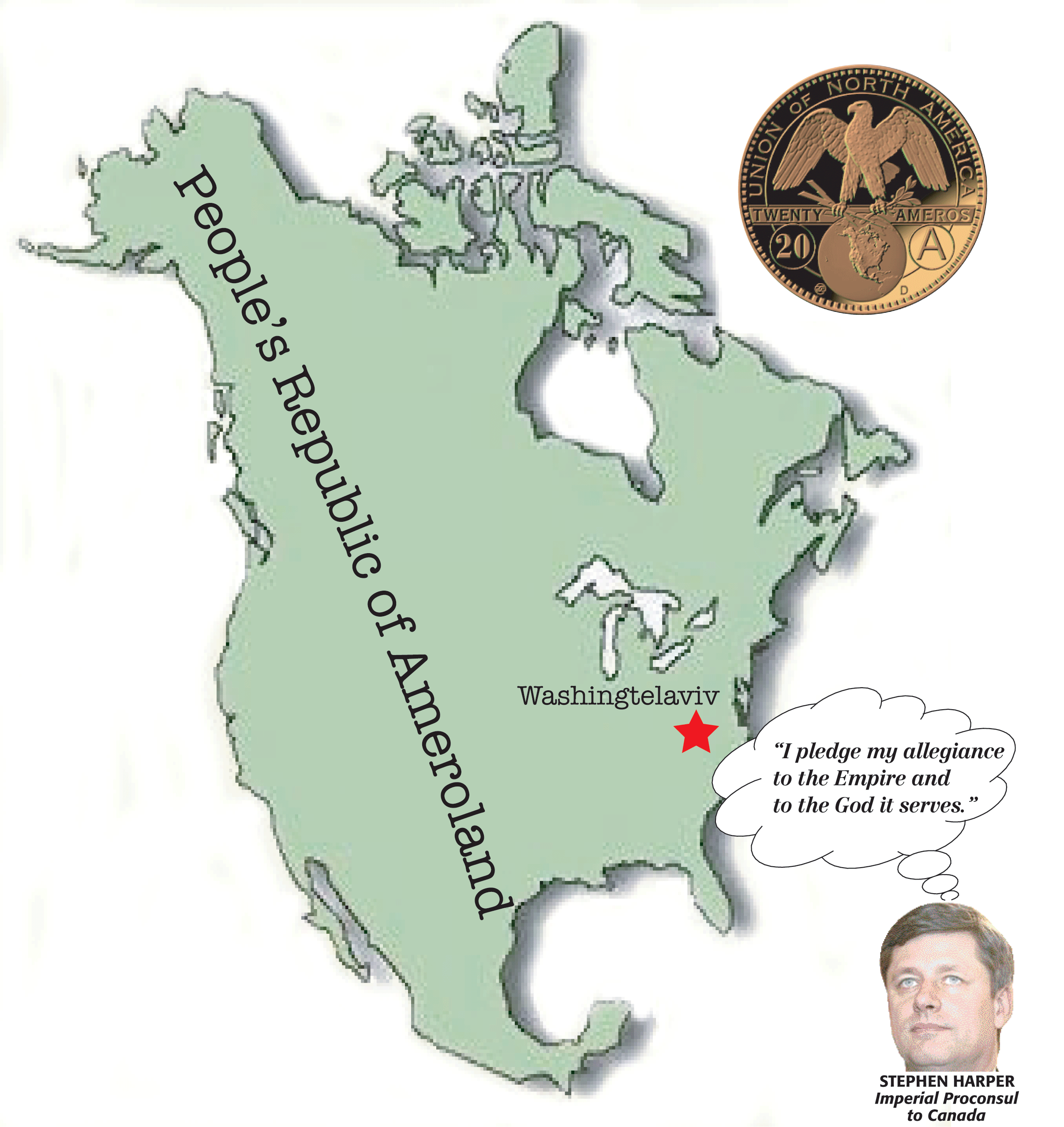 On the latter point he said: “Mexicans and Canadians do not want to be incorporated into the United States, and they are ambivalent about adopting the American dollar, but they are more willing to become part of a single country of North America and of a unified currency, like the “Amero,” proposed by Herbert Grubel.” Grubel, of course, is a former MP and now a senior econo-theologian at the Fraser Institute, the B.C.-based neo-con propaganda factory that has more influence on national policy than do elected MPs. He made his proposal in 1999!