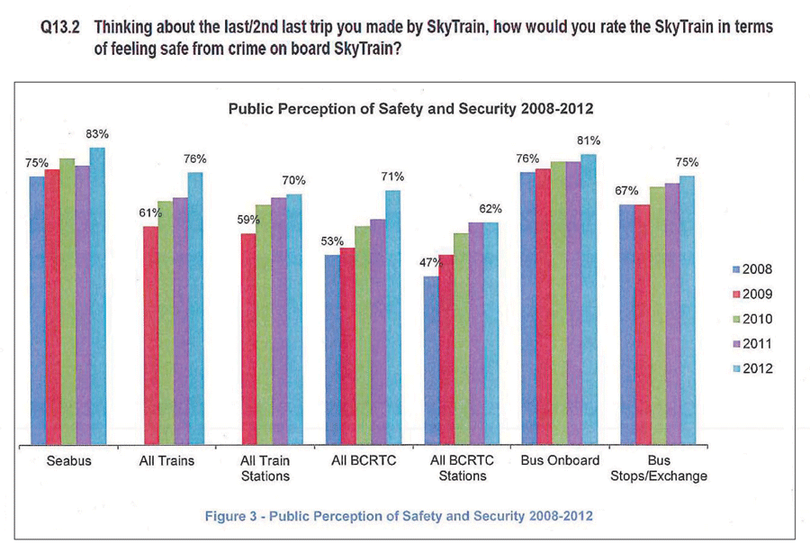 In fact, safety is not an issue, at least not as far as riders are concerned. On March 1, 2013, the transit police issued The Five-Year Trend Report 2008–2012, in response to a freedom of information request, The report, among other things, evaluated transit safety: