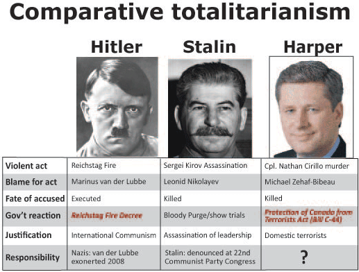 “Kirov was assassinated on Dec. 1, 1934, at the Leningrad Communist Party headquarters by a young party member, Leonid Nikolayev. Nikolayev and 13 suspected accomplices were shot. After the assassination, Stalin claimed to have uncovered a broad anti-Stalinist conspiracy to assassinate the entire Soviet leadership. The result was a bloody purge, in which hundreds of Leningrad party workers were executed and thousands of Communist Party workers were sent to forced-labour camps for alleged involvement.” COHEN: “But Kirov was powerful and well-known; Cpl. Nathan Cirillo wasn’t. Also, no bloody purges took place after the Ottawa shooting. I just don’t see the parallel, Eric.” BLAIR: “You’re paying too much attention to details and missing the larger picture. The specific characteristics of the killer and victim aren’t important. Also, Canadian totalitarianism is of a different nature than that practised by Hitler or Stalin. Remember Huxley: it is non-violent. What these examples show is that Hitler and Stalin both exploited a violent event to impose repression, and in his exploiting of the Ottawa shooting Harper behaved in the same way. What matters is the politics, not the person. If you look at this table I prepared (points to TV monitor) you will see what I mean.