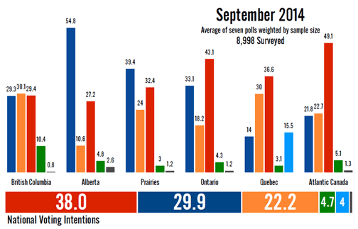 This result came out before the November-December Kinder Morgan fracas on Burnaby Mtn., so the Harperite numbers should be even further behind the Liberals. Notice, though, the danger that vote-splitting could cause in B.C., where the NDP has a slim lead and vies for the same voters as the Green Party.