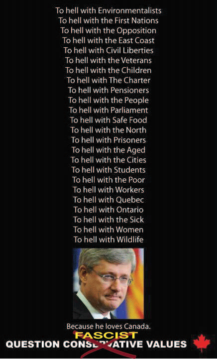 No amount of dirty tricks, character assassination, attack ads and false-flag operations can obscure the effects of his sociopathic régime. Harper has nowhere to hide, and I suspect there will be wholesale resignations as his minions flee the electoral slaughter to come. If the governor general lacks the balls to do his job, the public will have do it for him.