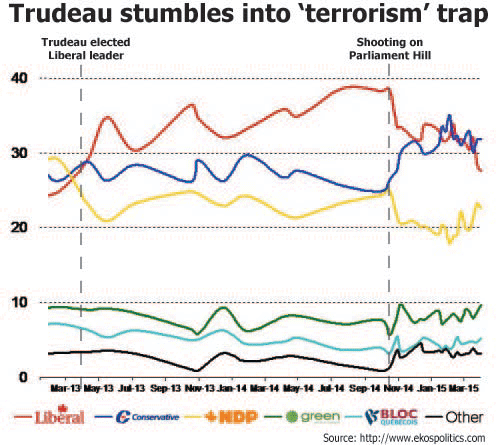 At this point, Mulcair and Trudeau were on the same page regarding the shooting, but Trudeau had a big advantage. His Liberals are far and away richer and more populous than Mulcair’s NDP, and he can tap into overwhelming national hatred for Harper and his anti-terrorism totalitarianism to outmanoeuver Mulcair. Since the Bill was announced, Harper’s terrorism smokescreen has lifted and opposition to state totalitarianism tripled in six weeks. Even key business leaders oppose it. All Trudeau had to do was channel this sentiment to become the people’s choice to restore Canada to parliamentary rule.