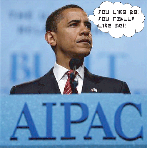Sen. Barack Obama’s major political liability is his unpopularity among The Lobby. Obama is young, erudite, and sophisticated, all of which make him a threat to the U.S. ruling class, which prefers to throw its support behind suggestible religious sociopaths. No matter how much Obama grovels and prostrates himself before the zionist hierarchy it never seems to be enough. As they say in organized crime: “He ain’t family.” At the AIPAC policy conference earlier this month, however, he managed to earn 13 standing ovations as he went beyond the call of servility to tell Israel and its agents what they wanted to hear.
