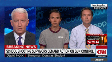 Cooper begins his Hogg segment in left field by describing funerals for four students; featuring three students who received military awards for heroism, though what heroic acts they committed is anybody’s guess; and commenting on students busing to the Florida state capital for a gun control vote.