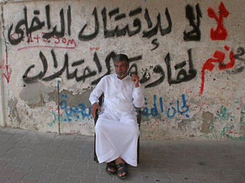 In Rafah in the southern Gaza Strip, a man sits next to a wall that reads in Arabic, “No to internal fighting. Yes to fighting the occupation.”