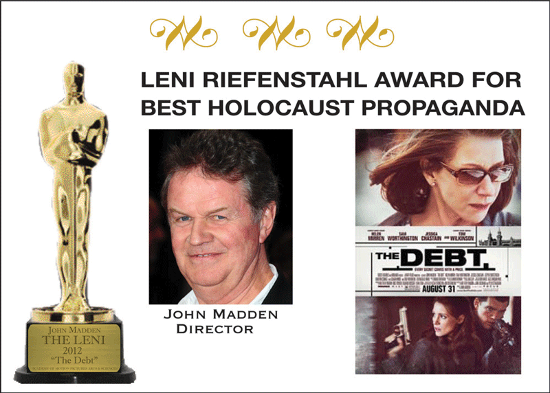 KALE: “Great idea! First, for those who don’t know, The Leni Riefenstahl Award is a new Oscar category for Holocaust® propaganda films. This year there a few worthy nominees, but my pick goes to The Debt, an espionage thriller about retired Mossad agents and the (supposedly) botched kidnapping/assassination of a Nazi war criminal.” BOYLE: “Good choice, but before we get to your analysis, let’s look at two films I had on my list that you didn’t pick: first, Footnote, the serio-comic Israeli film about duelling Talmudic scholars.” KALE: “I considered it, but decided the subject matter to be too esoteric. Admittedly, the Talmud has numerous passages that are cited to justify Jewish exceptionalism and the violent mistreatment of non-Jews, and this is clearly relevant to what we see today in Occupied Palestine and throughout the Middle East. However, The Leni is not a religious award. Moreover, since all organized religion is fundamentally irrational and can be exploited by militant lunatics to justify atrocities in the name of “god’s will,” nominating Footnote risked conflating Jews with Zionists, and that would itself have been an act of Holocaust® propaganda!” BOYLE: “Very logical! I hadn’t thought of that. OK, what about In Darkness, the Agnieszka Holland-directed story of Catholic Poles hiding Jews in the sewers of Lviv to keep them safe from Nazis?” KALE: “I debated a long time over this. The film clearly meets the Leni criteria of promoting the Jew-as-victim stereotype that drives the Israel-has-a-right-to-exist mantra. It also perpetuates our habit of compartmentalizing fascism to the Nazi era. As much as German fascists persecuted Jews, Jewish fascists are today persecuting Arabs. Gaza is recognized as the world's largest ghetto, and the Israeli press is very open about the extreme brutality, even bestiality, of Israeli settlers and soldiers toward Palestinians. The more we regurgitate World War II stereotypes the more easily we give ourselves permission to gloss over this reality.” BOYLE: “So, why didn’t you select it?” KALE: “Essentially, because it is based on a true story, and as such has a defensible historical component. It also shows Catholics being compassionate towards Jews, and this counters the argument that Polish Catholics were anti-Jewish. It, therefore, has some value.” BOYLE: “Now, tell us about The Debt and why you picked it to win The Leni.”