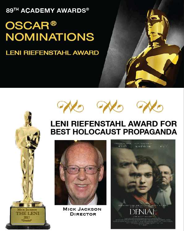 BOYLE: “Where do you want to start?” KALE: “Where else?—with my pick for the Leni Riefenstahl Award for Best Holocaust Propaganda.” BOYLE: “Ah, yes—The Leni; your favourite category.” KALE: “This year, the winner is exemplary. Never before has a Leni nominee showed the connection between the Holocaust® and Holocaust® propaganda so clearly. I think you know which film I’m talking about. Go on: open the envelope.” (She hands it to him.) BOYLE: “Ah yes. I thought so, but there have been many films that have defended the six-million figure and sanctified Auschwitz. What makes this film so remarkable?” KALE: “It exploits a real event to perpetuate a false history. Let me give you the context. The film is concerned with the infamous 2000 libel trial between historian David Irving and Holocaust® professor Deborah Lipstadt. In 1993, Lipstadt wrote Denying the Holocaust: The Growing Assault on Truth and Memory, a book in which she accused Irving of being a ‘Holocaust® denier’. “In the opening scene, Irving interrupts one of Lipstadt’s 1994 lectures and waves $1,000, saying he'll give it to anybody who can produce any written evidence that Hitler ordered the Holocaust®. Lipstadt bombastically claims she’ll debate the Holocaust® with anyone but not with someone who denies it. Now, if she had evidence it occurred, it should be a simple matter to dispatch someone like Irving, but the fact that she refused to debate him gave credibility to Irving’s assertion that Hitler never ordered the Holocaust®. “By the way, the film got this scene wrong. Irving’s actual words were: “I have here a thousand dollars for you [Lipstadt] if you can produce to this audience, now or at any time in the future, this document about which you have just lied to them.” BOYLE: “He was referring to what Lipstadt claimed happened at the Jan. 20, 1942, Wannsee Conference, right?” KALE: “Yes, but Lipstadt never produced any documents. In fact, nobody has. Lipstadt’s refusal to account to Irving for her claims and her ad hominem attack upon him led Irving to sue for libel.” BOYLE: “As I recall, Irving lost.” KALE: “Yes, and no. Lipstadt was found to have libeled Irving on four counts, but not on a fifth. Therefore, Mr . Justice Charles Gray concluded that Irving did not suffer damage to his reputation, despite the libels, so he lost his suit.” BOYLE: “One could say Irving lost his suit before it started. Merely being accused of being a ‘Holocaust® denier’ is enough to destroy anyone’s reputation, so even if Irving had proven that Lipstadt lied about him, the judge would still have rejected his claim.” KALE: “That’s why this film is so quintessentially Leni-esque! The prejudice against Irving was insurmountable. The fix was in. As The Guardian reported: ‘[The judge] said he found that Irving was “an active Holocaust denier; that he was anti-Semitic and racist and that he associated with right-wing extremists who promoted neo-Nazism.” ’ Here is Gray in his own words: