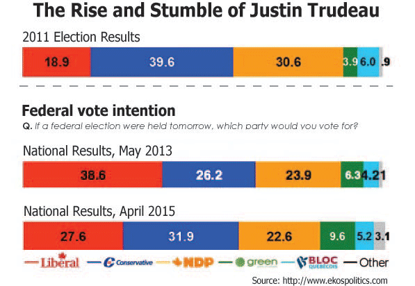 Opinion polls in the month following Trudeau’s election seemed to confirm that a reversion to Liberal rule was highly likely if not inevitable. In May 2013, voter support for the Liberals had more than doubled since the end of the 2011 election, whereas support for the Harperites had fallen by a third. Some of that Liberal growth even came at the expense of the centre-left New Democratic Party, which lost more than 20% support. Had an election been called at this time, the Liberals would have coasted to majority rule. What a difference two years makes.