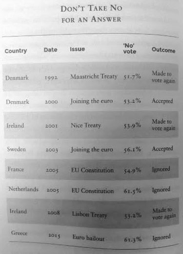 One cannot completely discount anti-Muslim xenophobia or anti-climate change obscurantism for the vote, but it would be wrong to reduce it to these two factors. Brexit is just the latest, most conspicuous, example of democratic alienation that has been a fact of life in Europe for more than two decades.As the table opposite shows, popular opposition to the EU has been ignored eight times since 1992, including twice in Denmark and Ireland where the public were forced into a revote for a treaty they didn’t want. As expected, a move is afoot to have the Brexit put to a revote. Allegedly there’s a petition with 3 million signatures in favour. The odds of it happening are slim, but the fact it’s being discussed is disturbing.