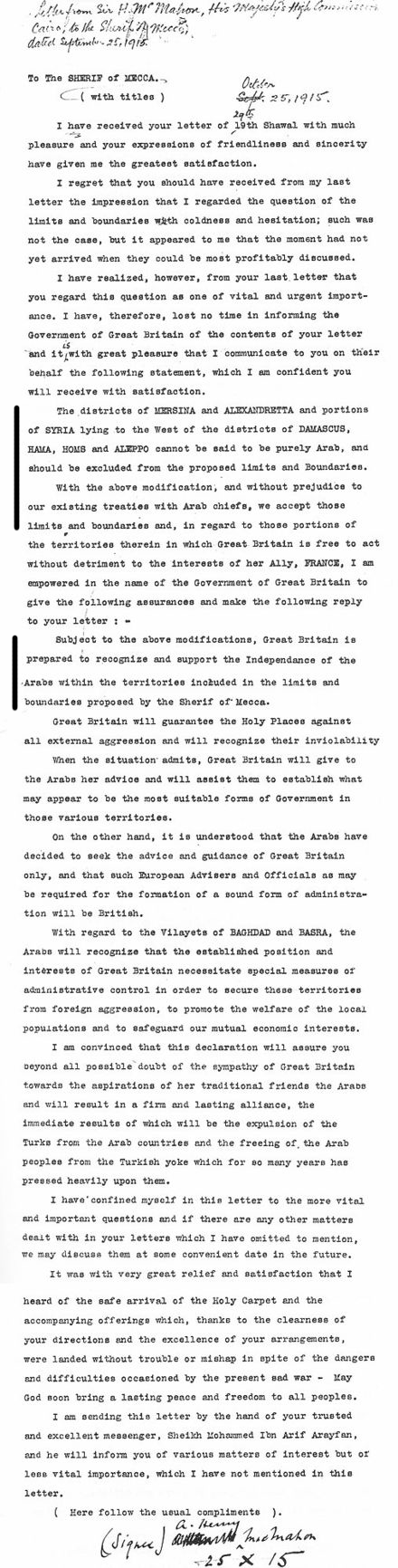 In one letter dated Oct. 25, 1915, the British High Commissioner to Egypt, Lt.–Col. Sir Henry McMahon, openly promised Palestine, inter alia, to the Sharif of Mecca. The Hussein–McMahon correspondence was a meaningful exchange between governments; the Balfour Declaration was merely a private letter addressed to a special-interest group, the Zionist Federation.