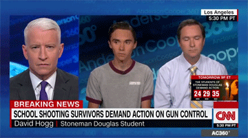 Cooper begins his Hogg segment in left field by describing funerals for four students; featuring three students who received military awards for heroism, though what heroic acts they committed is anybody’s guess; and commenting on students busing to the Florida state capital for a gun control vote.