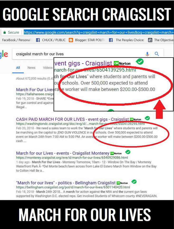 The gun control/anti-NRA frenzy has no defensible cause and effect. In fact, 33 days before the “March for our Lives To End School Gun Violence” on March 24, organizers posted ads on Craigslist offering to pay $200 to $500 per person to join the march’s “sales team.”
