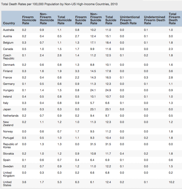 On Feb. 1, 2016, The American Journal of Medicine published a report of gun-related deaths in 22 wealthy nations for 2010 and found the U.S. murder rate to be 10.2 per 100,000 people compared to, say, Germany (1.1), Sweden (1.5), Canada (2.3) and the U.K. (0.2). According to the authors of the report: