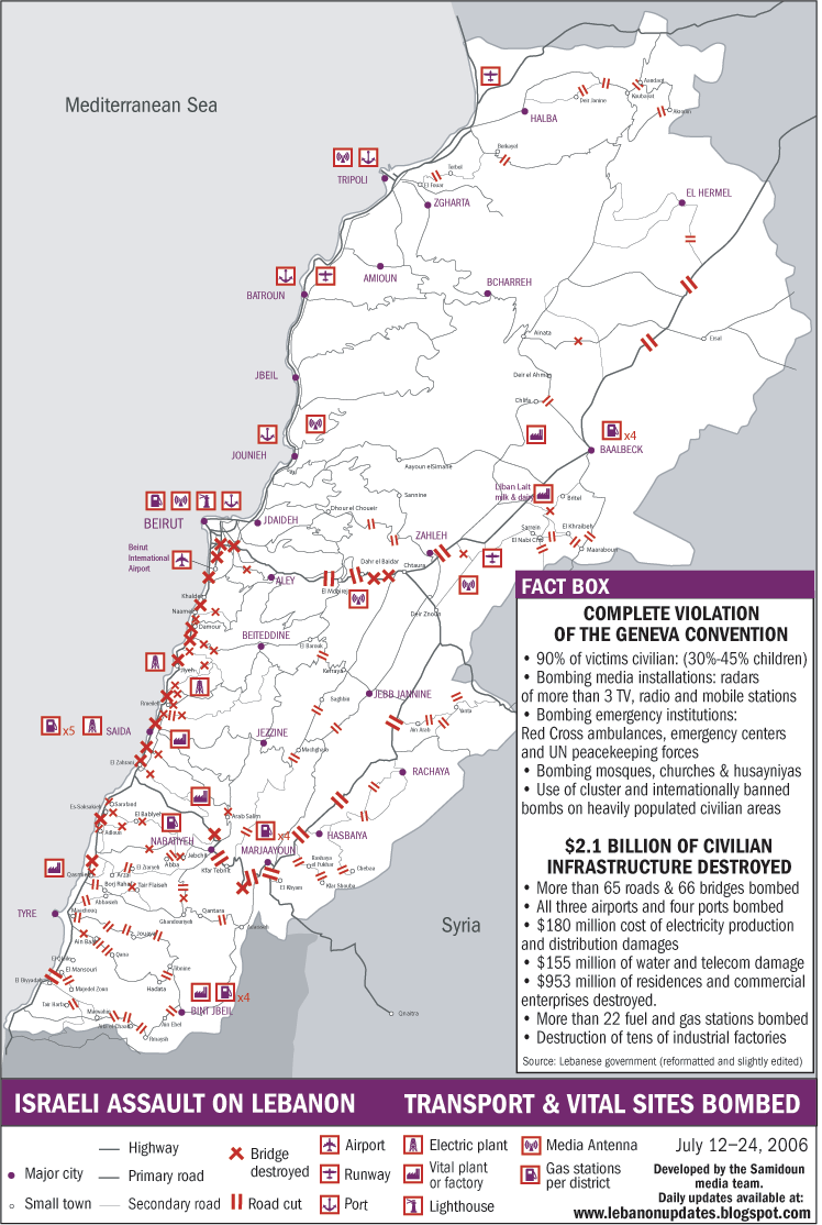 COHEN:: “If you look at the monitor to your right, prime minister, you'll see a map of Lebanon detailing the destruction caused by the Israeli Air Force from July 12 to 24. Every port, all three airports, 65 roads, 66 bridges, power plants, even a lighthouse have been destroyed. Not shown are the gruesome effects of the U.S.–supplied chemical, phosphorus and depleted uranium bombs, all of which are expressly outlawed. If you call this response ‘measured,’ what would you call extreme?”